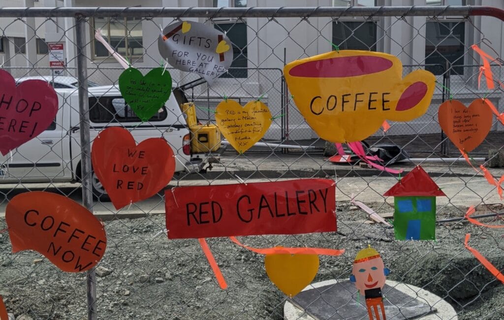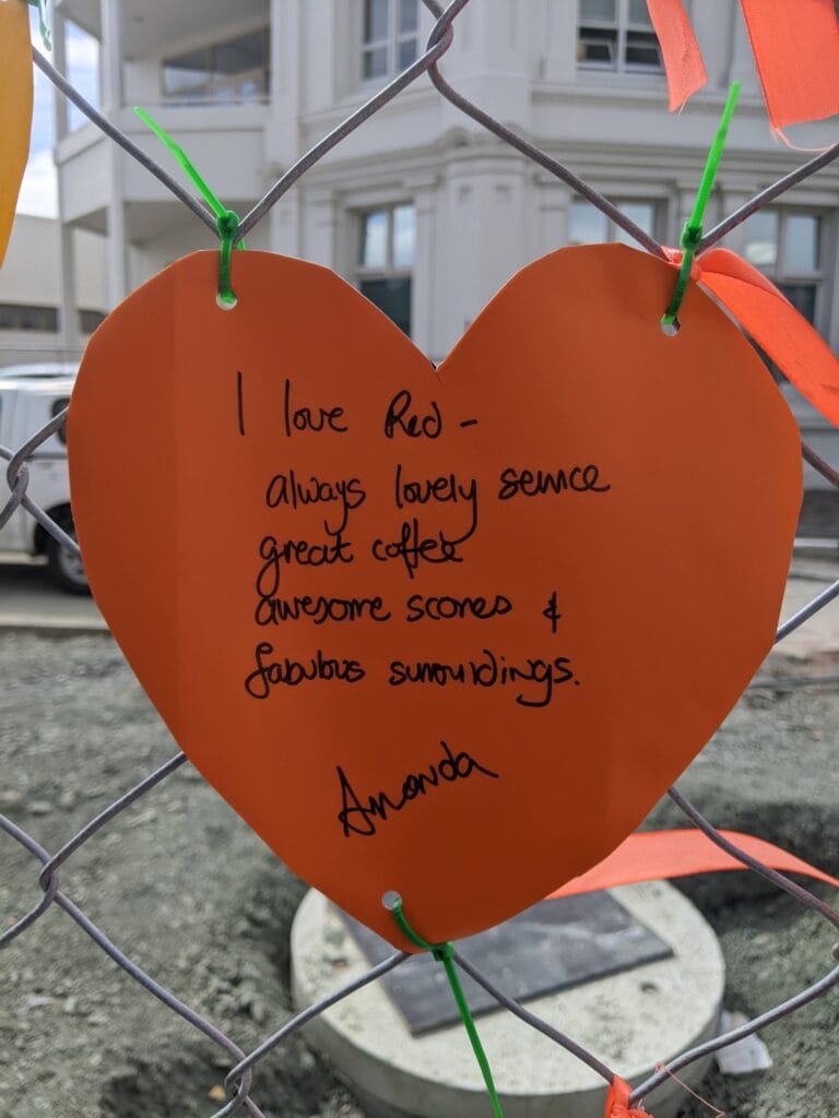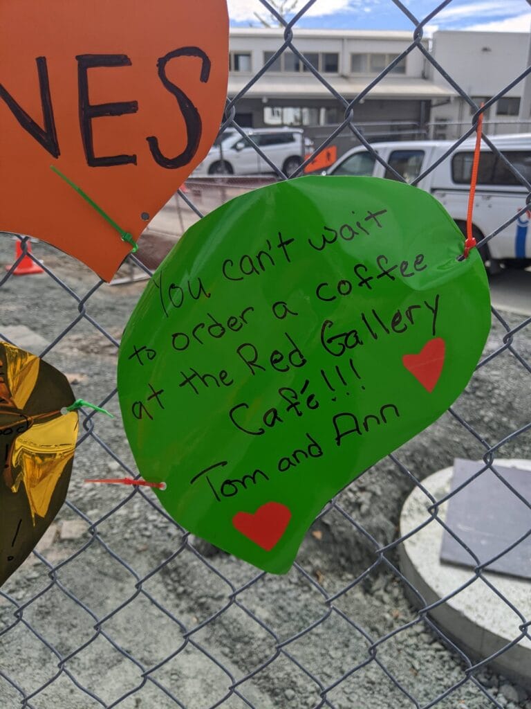 It can be words of support for your favourite cafe, a shout-out to the workers who are doing the hard yakka, or just a fun drawing that will encourage a smile from passers-by. A start has been made on the fences near Red Art Gallery, Design Store & Cafe. Scroll down to see some pics!