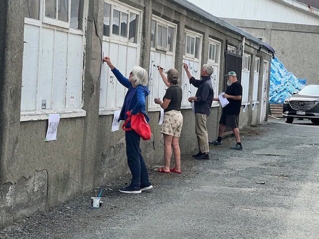 The 12 grungy white-washed windows, each divided into four portrait panes, were a new linear mural opportunity. The windows allowed natural light into an adjacent mechanic’s workshop, so a simple black line design was chosen to reduce blocking out the sunlight.