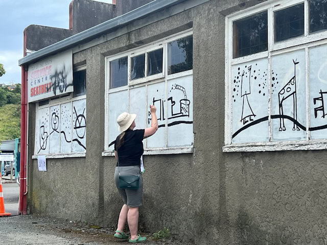 Richard Sellars did the concept designs, and 11 artists scaled them up and painted them on the windows over a single Sunday morning. The emphasis of this collaborative creative group endeavour was to produce in a free flowing, spontaneous and joyful way to bring a little ‘lift in spirits’ to a forgotten lane way.