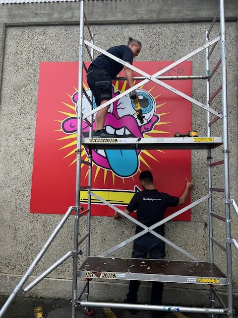 The symbols are based on some existing graffiti that was left in place. The 48 separate black and white images are playful and connected, leading the observer down the Royal Theatre Laneway to arrive at two large colourful faces signifying the back entrance to the Theatre Royal and to Rockquest.